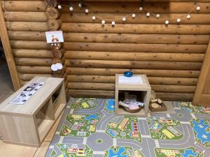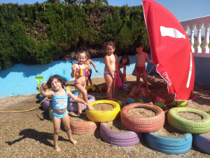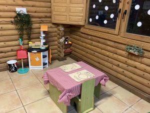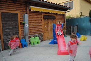 Aula 2: En este aula se encuentran los niños de 1 a 2 años. Dividida por rincones también, para orientar a los niños, el aula consta de 6 rincones: r. del lenguaje, r. del arte, r. sensorial, r. de la música, r. de la casita, r. de las construcciones. Material didáctico es adecuado a esta edad. Cuenta también con un aseo. Grandes ventanas para poder disfrutar de la luz natural. En este patio encontramos también material adecuado a esta edad como motos sin pedales, un tobogán, cochecitos de muñecas, balancines, etc.